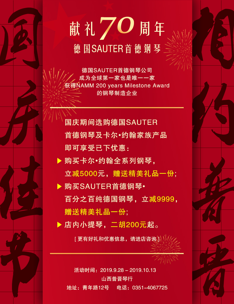 2016年11月10-12日,普晉琴行與九歌琴行將聯(lián)袂為省城的古典音樂(lè )愛(ài)好者奉上一場(chǎng)經(jīng)典的視聽(tīng)盛宴,我們有幸通過(guò)貝希斯坦鋼琴官方邀約到了古典音樂(lè )界的傳奇大師希普林•卡薩利斯,將在三天內舉辦涵蓋音樂(lè )會(huì )、大師課、藝術(shù)沙龍等多種形式的音樂(lè )活動(dòng),這也是繼“2016 晉歌音樂(lè )藝術(shù)季”后普晉琴行攜手九歌琴行又一輪重磅活動(dòng)。