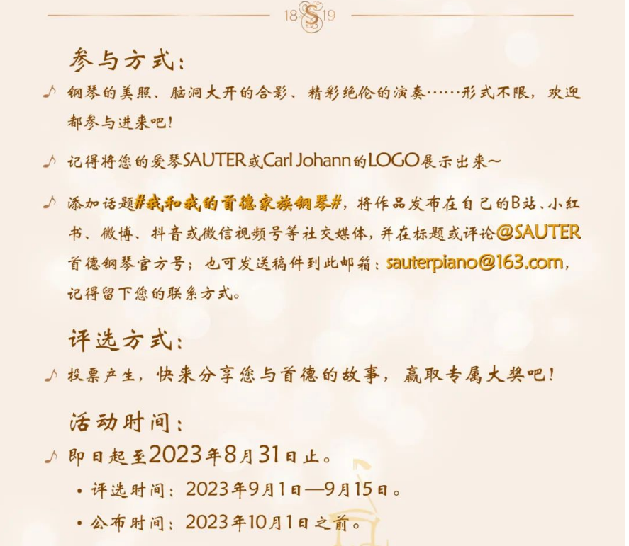 ④添加話(huà)題 #我和我的首德家族鋼琴# 發(fā)表在您的個(gè)人社媒頻道,并在標題或評論@首德鋼琴官方號;或也可發(fā)送稿件到此郵箱:sauterpiano@163.com,記得留下您的聯(lián)系方式。